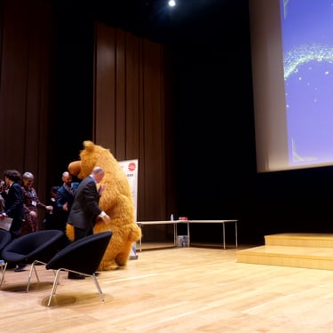 Mais le meilleur était à venir. Lors du pot qui a suivi, j'ai vraiment pu interagir avec les étudiants et leurs familles. C'était un mélange de selfies, de discussions animées (bien que je ne pouvais que hocher la tête et faire des gestes avec mes pattes d'ours), et de rires partagés. J'ai même surpris quelques larmes de joie chez certains parents, émus de voir leurs enfants diplômés.